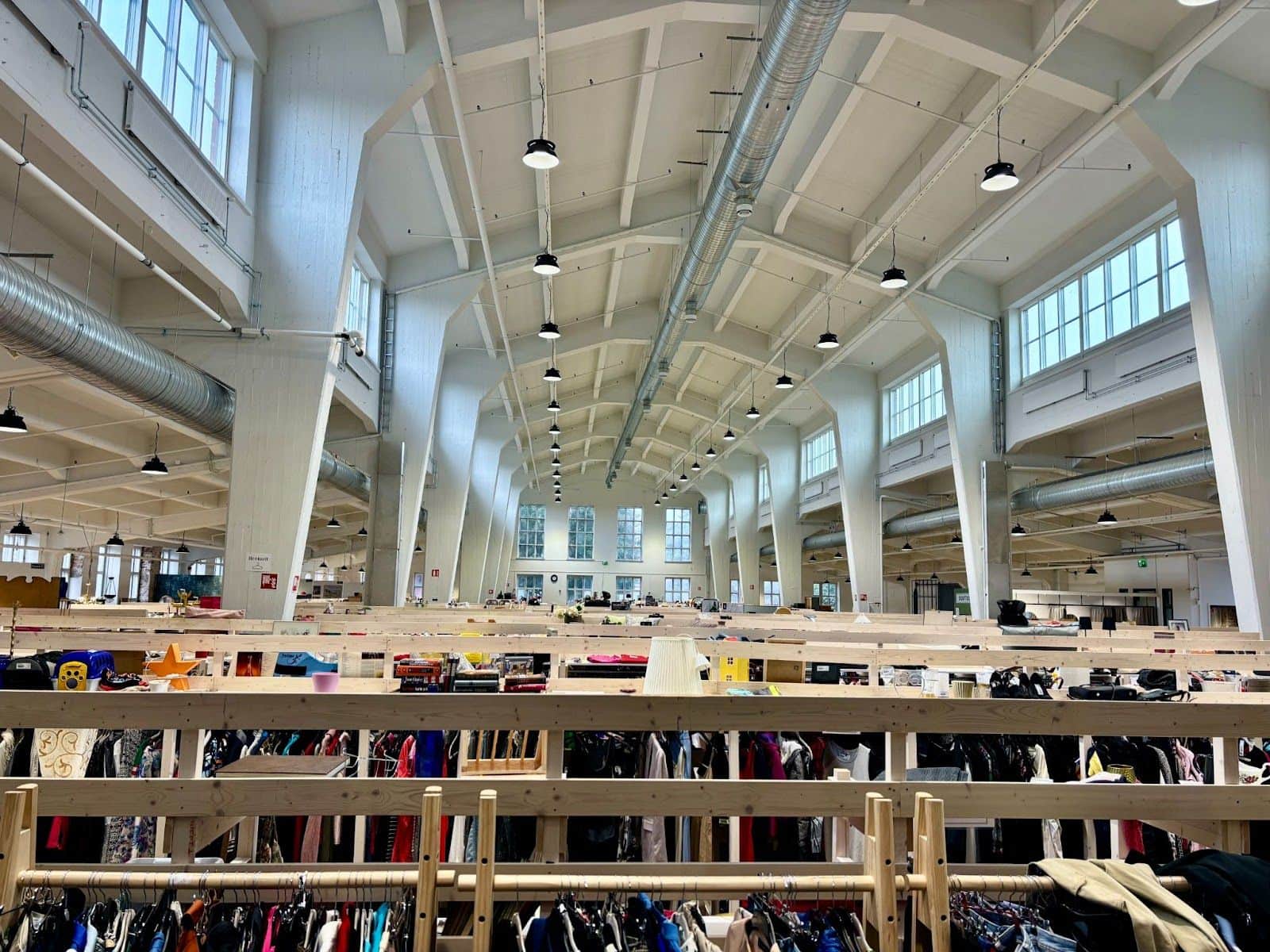 C’est en 2023 que Tero et Heidi Airaksinen, propriétaires de plusieurs kirppis* en Finlande, ont vu l’opportunité de redonner vie à ce bâtiment historique. Un travail remarquable qui a nécessité un gros investissement. Tout a été modernisé : le système de chauffage, ventilation et climatisation a été entièrement remis à neuf, et des espaces de détente ainsi que des sanitaires ont été créés . La salle de tissage, avec son plafond impressionnant de 12 mètres, a été repeinte pour accentuer l’espace, tandis que la lumière naturelle des grandes baies vitrées inonde désormais les lieux, offrant une atmosphère chaleureuse et apaisante.