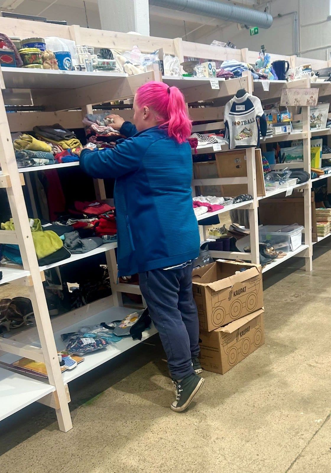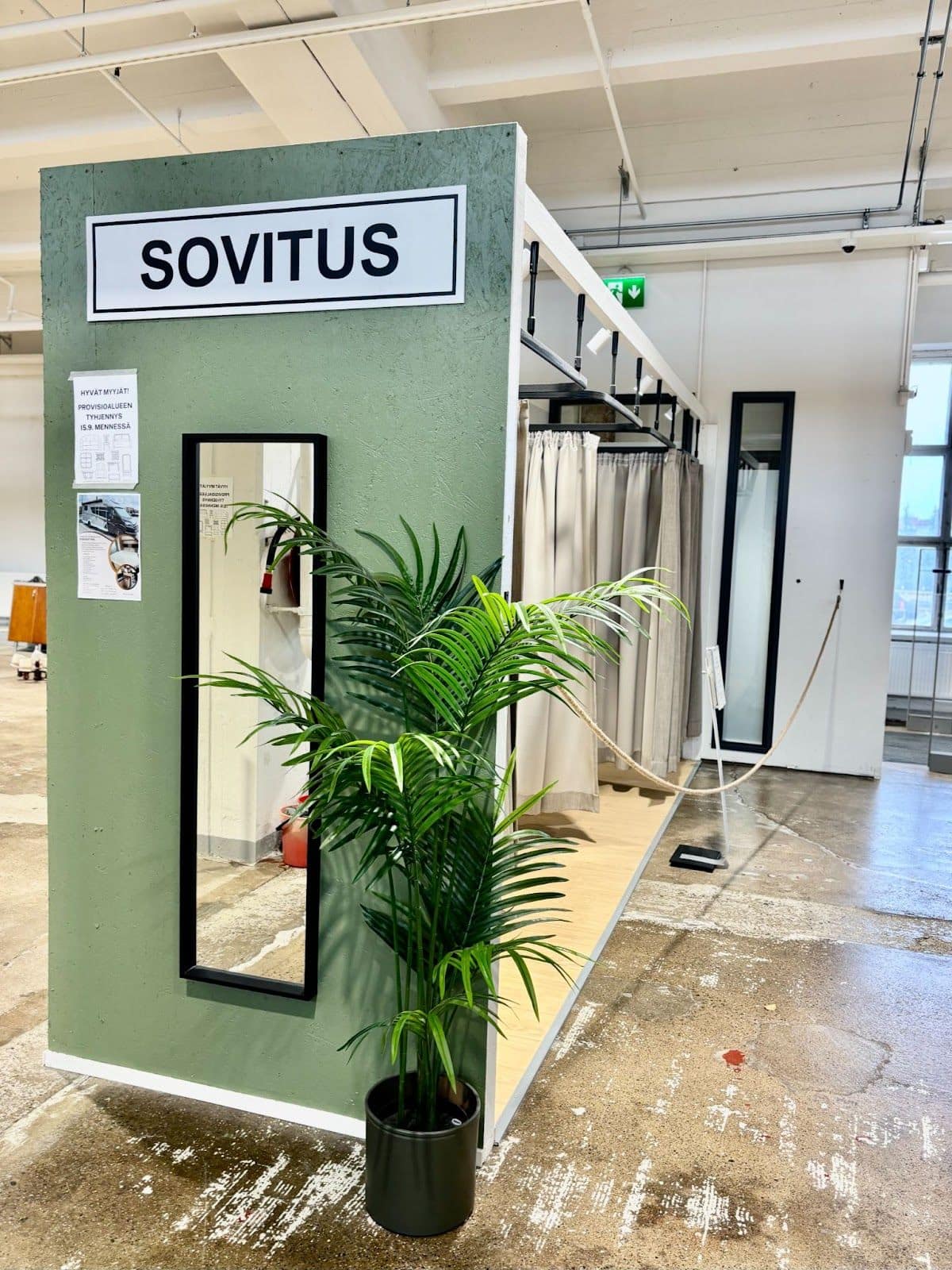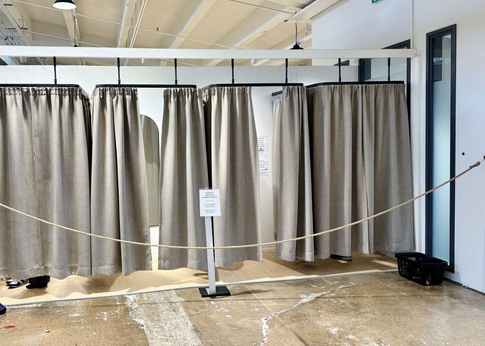 Au Villatehtaan kellari, tout est pensé pour rendre l’expérience de shopping agréable, autant pour les vendeurs que pour les acheteurs. De larges allées permettent de circuler facilement, même pour les personnes à mobilité réduite. Si l’on souhaite tester les vêtements, il y a quatre cabines d’essayage bien situées à l’entrée du magasin.