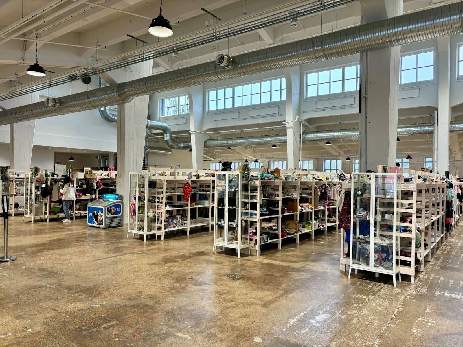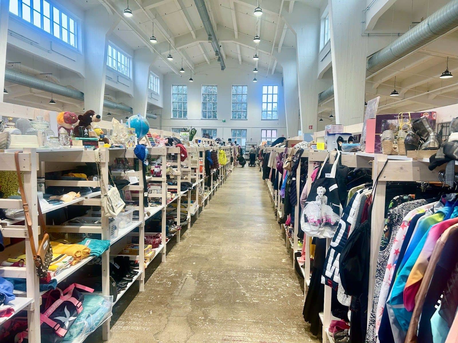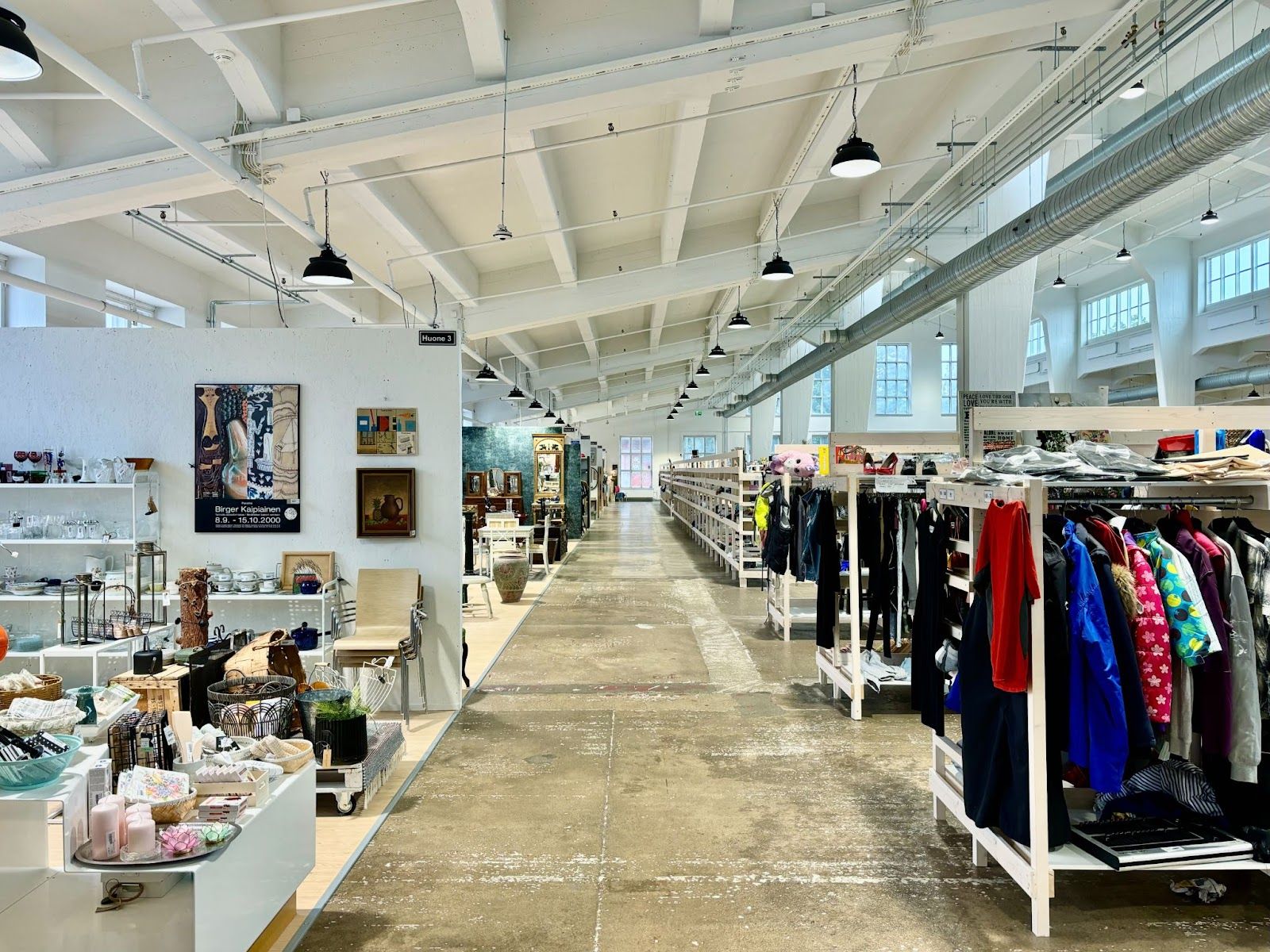 C’est en 2023 que Tero et Heidi Airaksinen, propriétaires de plusieurs kirppis* en Finlande, ont vu l’opportunité de redonner vie à ce bâtiment historique. Un travail remarquable qui a nécessité un gros investissement. Tout a été modernisé : le système de chauffage, ventilation et climatisation a été entièrement remis à neuf, et des espaces de détente ainsi que des sanitaires ont été créés . La salle de tissage, avec son plafond impressionnant de 12 mètres, a été repeinte pour accentuer l’espace, tandis que la lumière naturelle des grandes baies vitrées inonde désormais les lieux, offrant une atmosphère chaleureuse et apaisante.